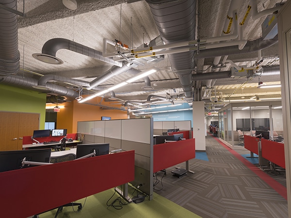 While our work typically is hidden behind ceilings and walls, that wasn’t the case in this open environment. We paid special attention to the aesthetics of heating, cooling, electrical and communication system placement and carefully selected the locations of electrical outlets, ductwork and other infrastructure to account for modular walls and furniture. We partnered with an audio-visual expert to select and install interactive video conference equipment and brought in an acoustical consultant to advise the design team on the best ways to avoid noise and privacy issues.