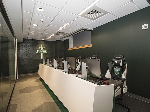 Competitive “eSports” are taking off at universities across the country, and IWU wanted to get ahead of the curve with a program and facilities capable of attracting top-ranked athletes. Creating state-of-the-art training and competition rooms for sports gaming required converting two existing classrooms and offices, both tight spaces, in a short timeframe.