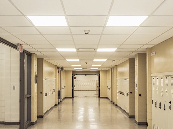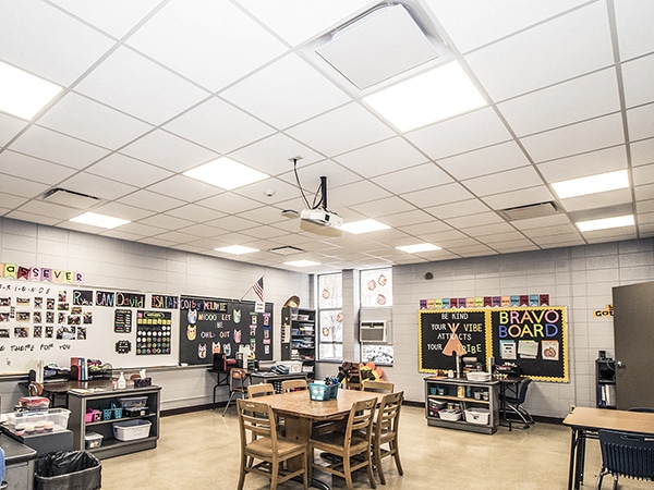 Air conditioning the remaining 40% of this high school proved the roof wasn’t strong enough to house an air-handling unit. A tight budget for both HVAC and lighting upgrades, along with a summer-only work schedule, added to the challenge.
