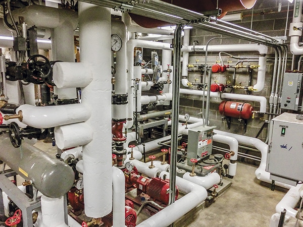 To bring modern air-handling to this 1970s-era residence hall, we designed a rooftop penthouse to hold a new 16,000 cfm make-up air unit that brings 100% outside air to the restrooms. The unit’s energy-recovery wheel transfers heat from the exhaust air stream to the outdoor air stream to improve overall efficiency. Also included in the project were a complete overhaul of the building’s central HVAC systems, all new plumbing and piping, lighting and power system upgrades, and replacement of all sprinklers in the center core.