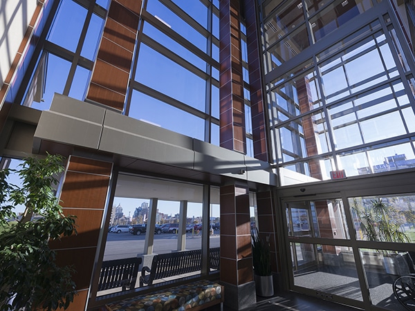 To reduce costs, we incorporated the parking deck’s existing stair and elevator tower into the new entrance. The renovation also included a new smoke evacuation system to protect the three-story atrium, a new helipad including lighting and coordination with flight paths, and a snow-melt system to decrease snow removal efforts and improve patient safety. Installation of IP cameras connected to a central recording system increased patient and employee security, and the addition of dual electric car charging stations encouraged the use of energy-efficient cars.