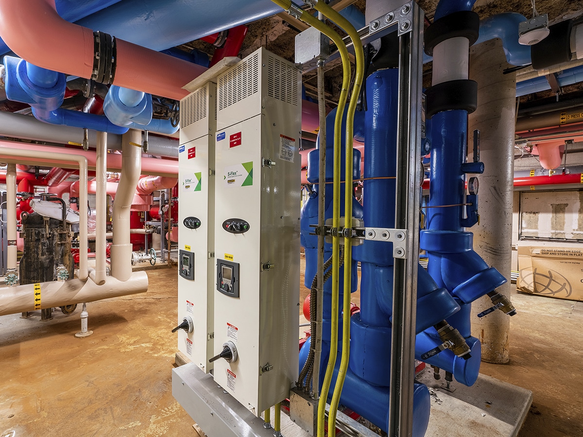 Our design calls for construction of a new steel platform on the roof of the building, which will house a new 25,000 cfm air-handling unit. We will run new ducts to the mechanical room, tie them into the existing ductwork, then remove the existing units. That will free up space in the mechanical room for a comprehensive HVAC system upgrade with new pumps, heat exchangers and chilled water systems. Other upgrades will include power distribution modifications and emergency power additions, as well as all new lighting and fire protection in the mechanical room.